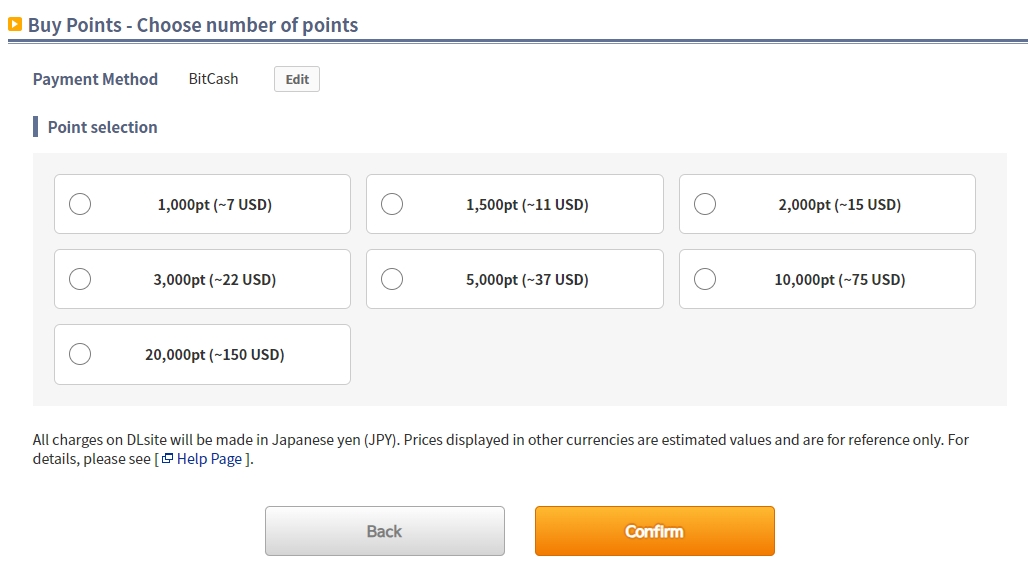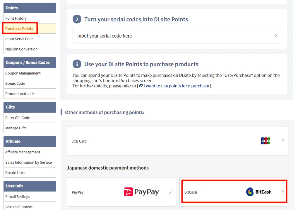 2. Select "Purchase Points" in the [Points] column and select "BitCash" in the [Japanese domestic payment methods].