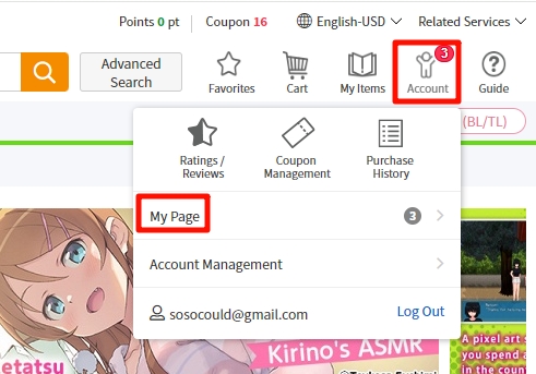 1. Log in to DLsite official website https://www.dlsite.com/home and go to "My page" from [Account].